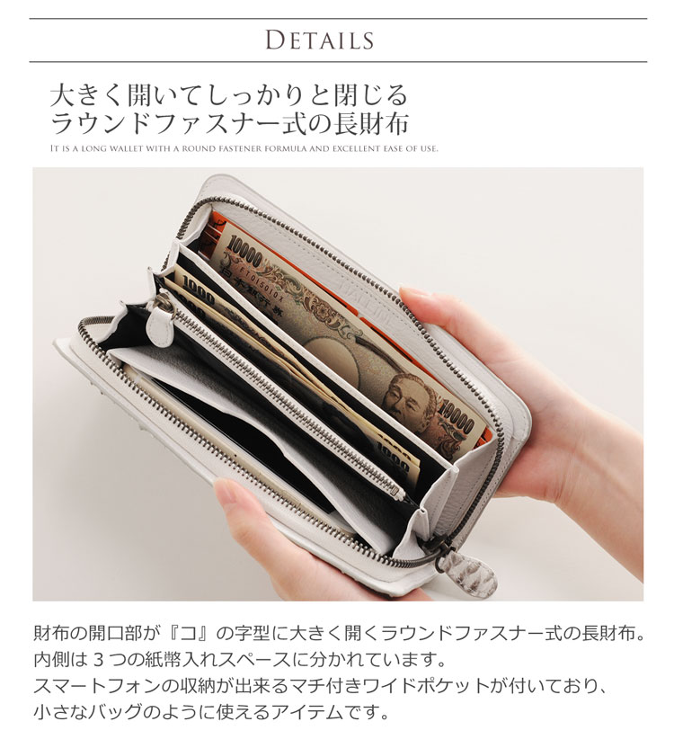 ●スタイル大きく開いてしっかり閉じるので、お会計もスムーズに行えるラウンド財布です。